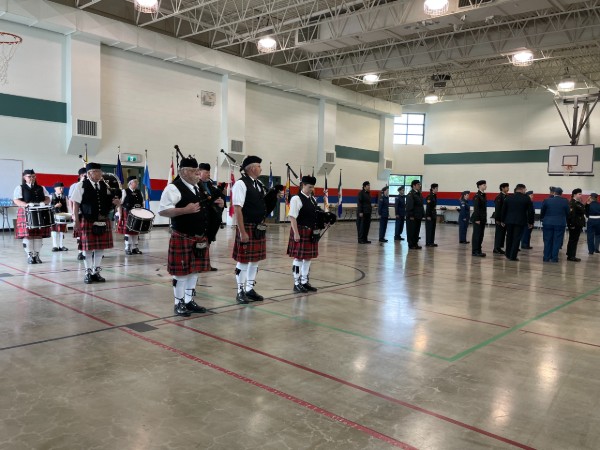 On June 11, 2024 the Kenora Scottish Pipes and Drums with the assistance of Wes Sheppard, piped the Army and Air Cadets into the drill hall at the Private David Kejick, DCM, Armoury for their annual review and awards ceremony.