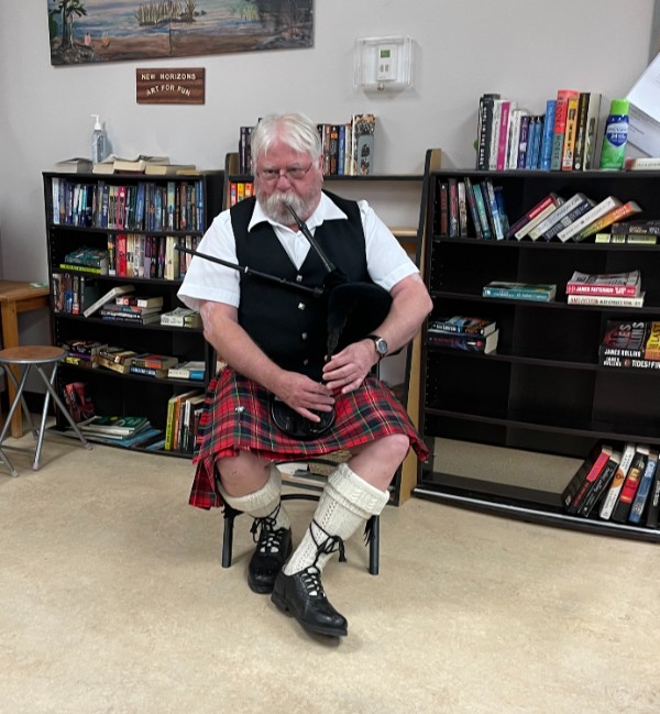 Kenora Scottish Pipes & Drums Pipe-Major Cecil Burns entertaining the Monday lunch crowd in Kenora with his parlour pipes.