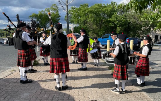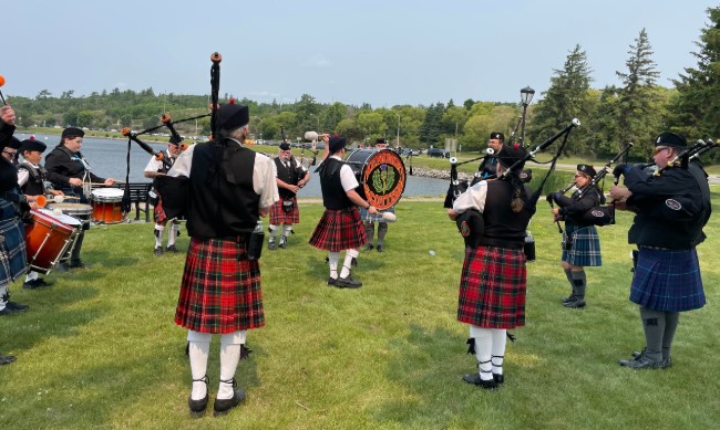 Kenora Scottish & St. Andrews Band warming up for the 2025 Canada Day parade on the Kenora Harbourfront.