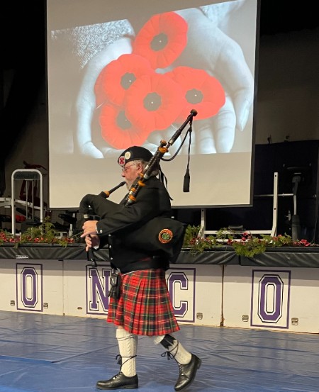 Pipe-Major Cecil Burns playing at Beaver Brae Secondary School Remembrance Day service on November 11, 2025